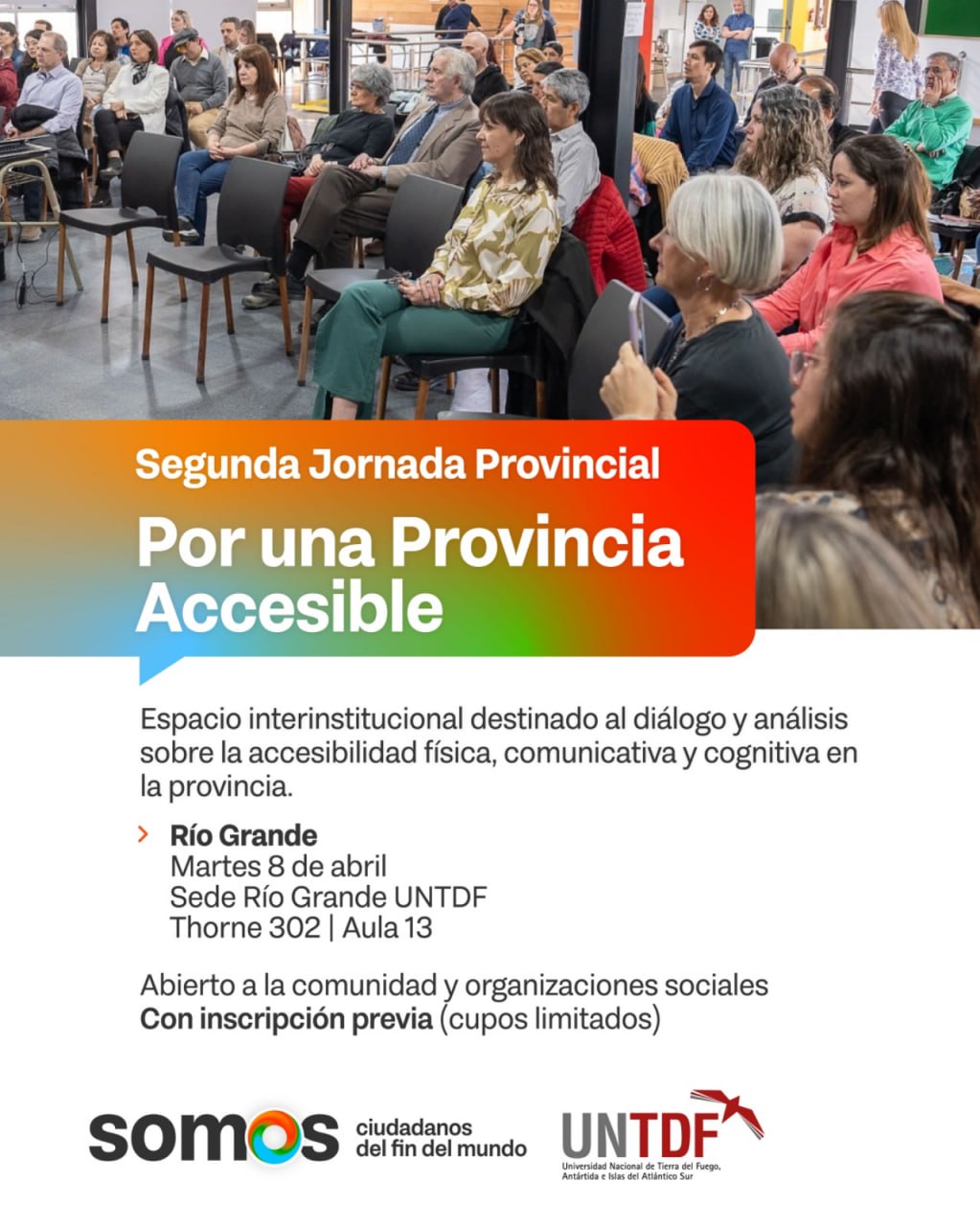 El Gobierno de la Provincia junto a la Universidad Nacional de Tierra del Fuego (UNTDF), invitan a toda la comunidad a participar en la Segunda Jornada Provincial “Por una Provincia Accesible”. Un espacio interinstitucional destinado al análisis y al diálogo pluralista sobre el estado actual de la accesibilidad física, comunicativa y cognitiva en la provincia. El encuentro tendrá lugar el martes 8 de abril en la sede UNTDF Río Grande, ubicada en Thorne 302. Es preciso realizar inscripción previa completando un formulario a través del siguiente link: https://docs.google.com/forms/d/e/1FAIpQLSedZmDHwAIA__xBSHtbgb9z2NWdyVDqgUSWdz-lQg0ze7HU6Q/viewform El evento está dirigido especialmente a equipos técnicos y funcionarios de los ministerios y organismos provinciales, gobiernos municipales, universidades y entidades nacionales, así como a asociaciones civiles que trabajan en las áreas de discapacidad, accesibilidad y derechos de las personas mayores. También se extiende la invitación a empresas interesadas y a la ciudadanía en general. El objetivo es dar continuidad a los debates iniciados en noviembre de 2023 durante la jornada “Políticas Para el Logro de una Provincia Accesible”, con la finalidad de reflexionar sobre la accesibilidad e impulsar la construcción de una Tierra del Fuego más inclusiva y accesible para todas las personas. El espacio permitirá no solo la reflexión sobre las problemáticas vinculadas a la accesibilidad, sino también la elaboración de propuestas concretas orientadas a alcanzar la inclusión plena y la accesibilidad universal. Además, la jornada tiene como objetivo fortalecer intercambios entre organismos gubernamentales y organizaciones de la sociedad civil. La actividad se llevará a cabo de manera presencial y contará con talleres donde expondrán personas expertas en la temática. Las presentaciones iniciales estarán a cargo de facilitadores que abrirán el debate y fomentarán el diálogo participativo entre quienes asistan. Este modelo colaborativo facilitará la construcción de un diagnóstico actualizado sobre accesibilidad y la formulación de estrategias concretas para avanzar en esta materia. Asimismo, se dispondrá de intérpretes en lengua de señas para garantizar un acceso más equitativo y efectivo a los contenidos tratados durante la jornada. Con esta iniciativa, el Gobierno de la Provincia y la UNTDF reafirman su compromiso con la construcción de una provincia inclusiva y accesible para todas las personas, promoviendo espacios de encuentro, reflexión y acción colectiva.